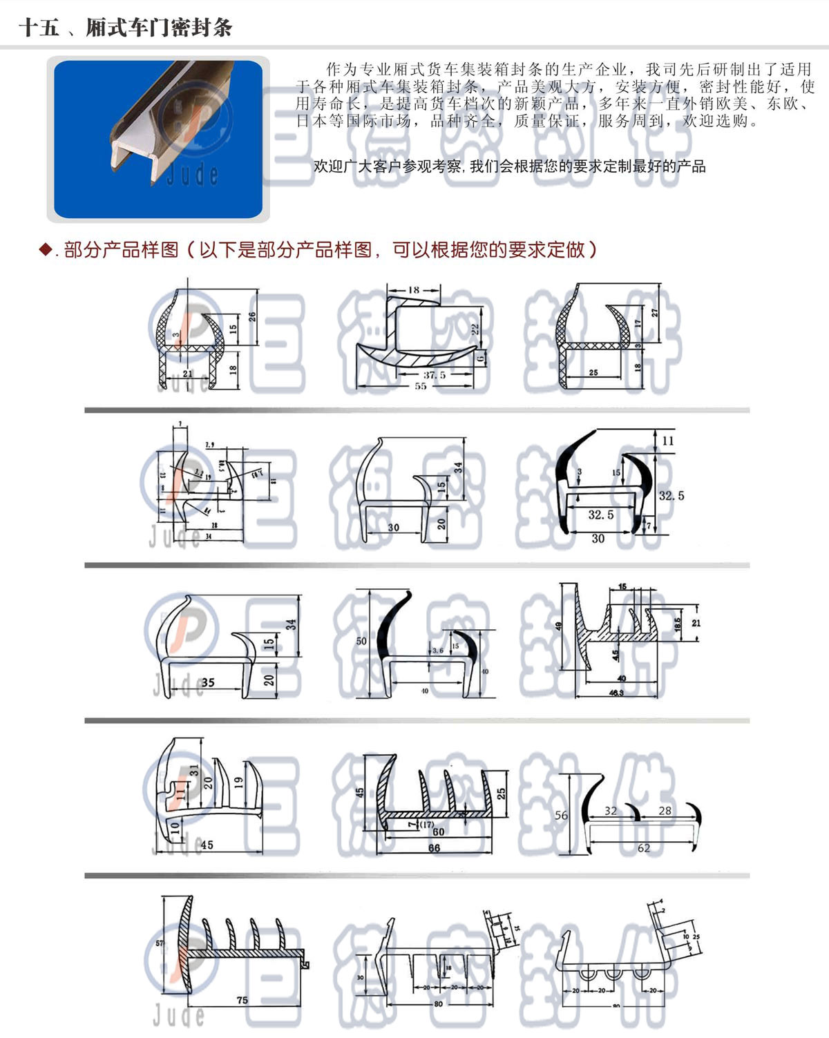 產(chǎn)品特點: 1.該產(chǎn)品是進口橡膠(EPDM)為原料進高溫硫化擠壓成型等工藝制作而成因此產(chǎn)品在使用壽命耐高低溫和使用成本上大大優(yōu)于其他材質(zhì)密封條。 2.由于它不同于傳統(tǒng)的橡膠封條,故存放方便,按裝簡單快捷,減少了勞動強度,加快了工程進度,可降低施工費用。 3.該產(chǎn)品外形美觀,使用后提高箱式汽車的產(chǎn)品檔次,使其更具有市場競爭力。