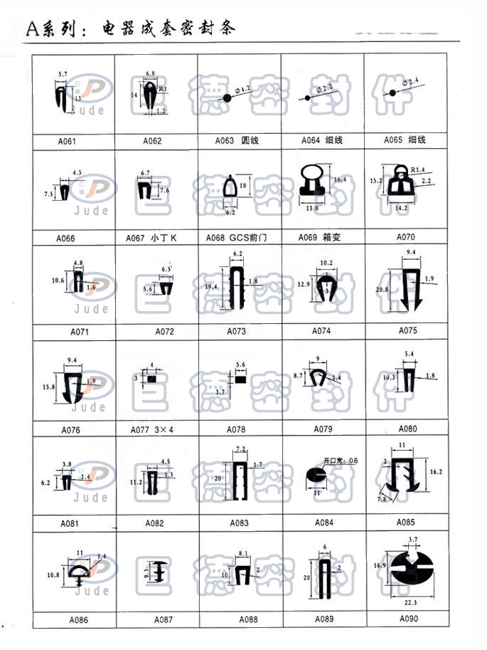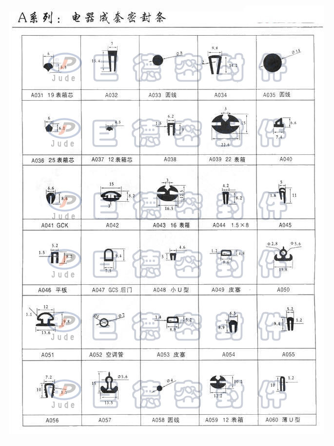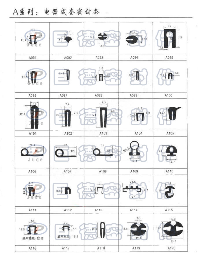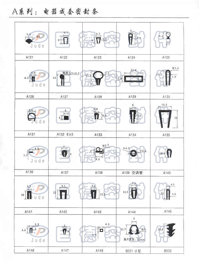 以上是部分產(chǎn)品斷面示意圖(可根據(jù)客戶要求訂做): 防水密封條采用三元乙丙橡膠,經(jīng)微波硫化工藝一次成型,表面光潔美觀,具有良好的彈性和抗壓縮變形,耐天候老化、耐臭氧、耐化學(xué)作用及較寬的使用溫度范圍(-40℃~+120℃)等性能,已被汽車門窗幕墻機(jī)械等制造業(yè)廣泛應(yīng)用。對(duì)不同形狀,不同材質(zhì),或耐寒、耐熱、發(fā)泡、實(shí)身,以及具有特殊性能等要求的產(chǎn)品,均能滿足設(shè)計(jì)和使用的需要。